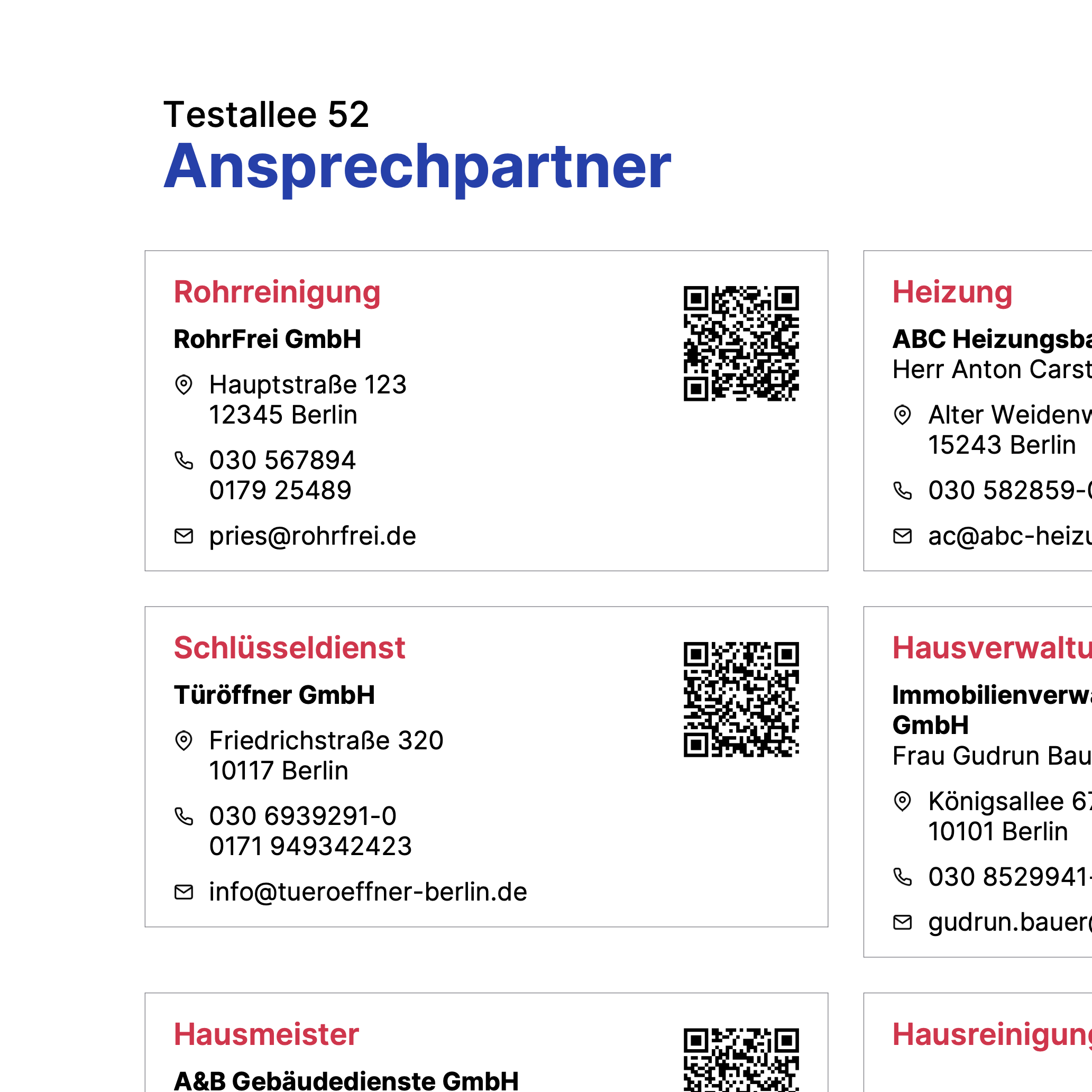 26. März 2021Bereits seit längerem können alle für die WEG relevanten Ansprechpartner (Hausmeister, Verwaltung, Heizung, Aufzug, etc.) in WEG+ erfasst und eingesehen werden. Nun gibt es zusätzlich die Möglichkeit, eine Übersicht dieser Ansprechpartner als PDF auszugeben und zum Aushängen im Hausflur auszudrucken.