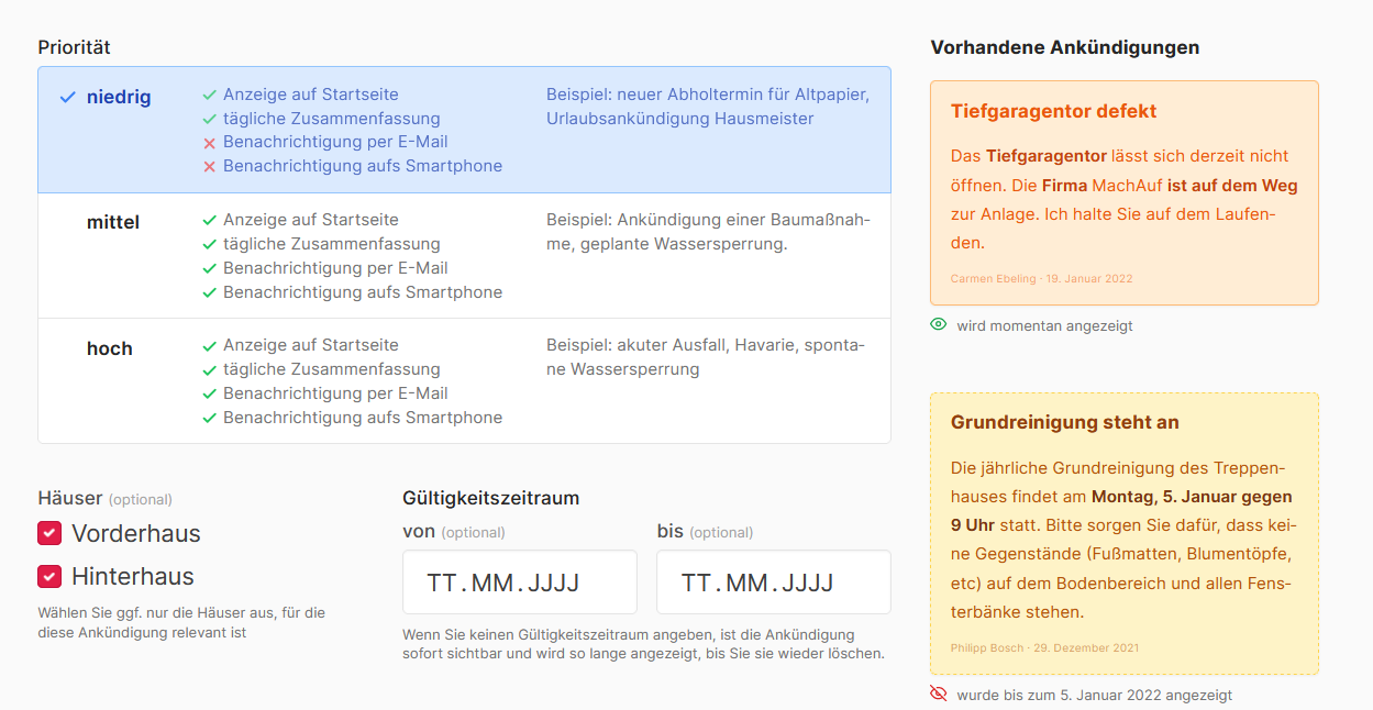 31. Januar 2022Wir haben den Bereich Ankündigungen umfassend überarbeitet. Unter anderem kann man nun Prioritäten für Ankündigungen festlegen mit entsprechender Logic für die entsprechende Benachrichtigung. Ankündigungen können nun im Vorfeld eine Laufzeit bekommen, so verschwinden sie wenn sie nicht mehr gültig sind. Außerdem kann man nun Ankündigungen für einzelne Aufhänge generieren.