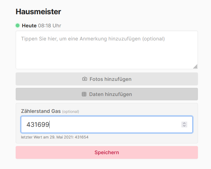 30. Juni 2021Unsere Bereiche wachsen mit Kundenanfragen. Im Bereich Dienstleistungen gibt es nun die Möglichkeit, dass z.b. die Hausmeister nicht nur eingeben, was sie gemacht haben sondern auch Daten (z.b. Zählerstände) in ein entsprechendes Feld strukturiert eingeben können. Diese landen dann in einer Übersicht z.b. im Bereich Smart Data. Da können sich die EigentümerInnen dann die Entwicklung dieser Daten anschauen.