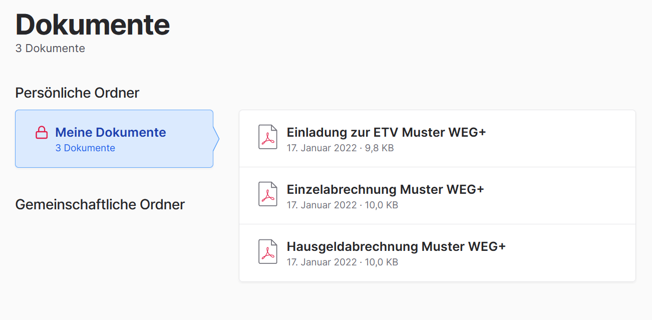 20. November 2021In WEG+ kann man seit Anfang an Dokumente für die WEG hochladen. Nun gibt es zusätzlich die Möglichkeit, Dokumente die nur eine Wohneinheit betreffen im persönlichem Ordner abzulegen. So haben Eigentümer·innen nun auch ihre individuelle Abrechnung jederzeit digital verfügbar.