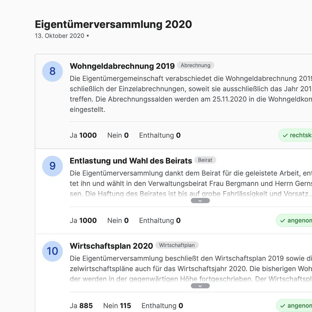 27. November 2020Der Bereich Beschlüsse wurde komplett überarbeitet. Die auffälligste Neuerung ist die übersichtlichere Darstellung. Es gibt nun weiterhin die Möglichkeit, Beschlüsse Kategorien (z.B. Abrechnung, Instandhaltung) zuzuordnen und danach zu filtern. Auch gibt es nun die Möglichkeit, alle erfassten Beschlüsse mit der Suchfunktion zu durchsuchen.