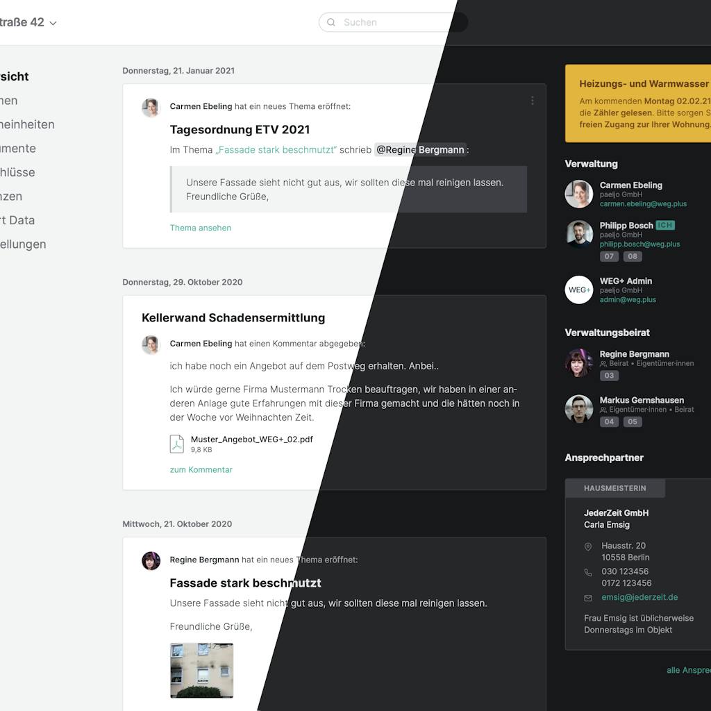 26. Februar 2021WEG+ hat jetzt eine alternative dunkle Darstellung, die insbesondere bei dunklen Lichtverhältnissen eine augenschonendere Benutzung erlaubt. Standardmäßig wird die Einstellung Ihres Betriebssystems übernommen. Sollten Sie dort beispielsweise dauerhaft den "Dark Mode" aktiviert haben, richtet sich WEG+ auch danach. Sie können aber die Einstellung jederzeit auch über einen Klick auf Ihr Benutzersymbol oben rechts ändern.